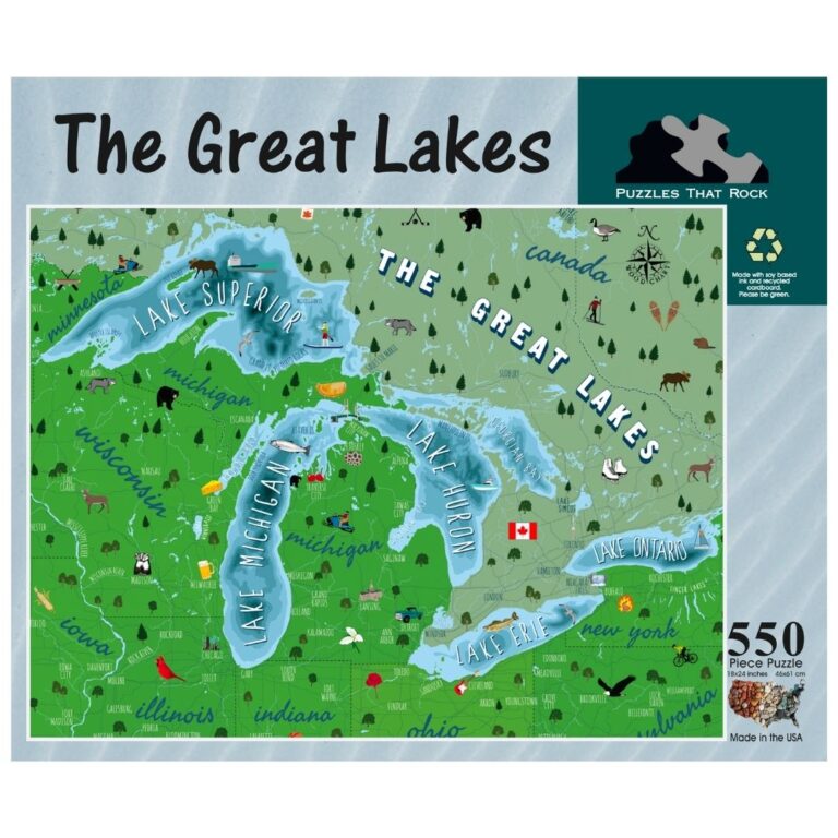 Piece together the beauty of the Great Lakes with this vibrant, educational puzzle. Featuring detailed artwork of all five lakes, it’s perfect for geography lovers, families, and puzzle enthusiasts alike. Made from sturdy, high-quality pieces, this puzzle offers hours of fun while celebrating one of North America’s most iconic natural wonders. Ideal for cozy cabin days or rainy afternoons.