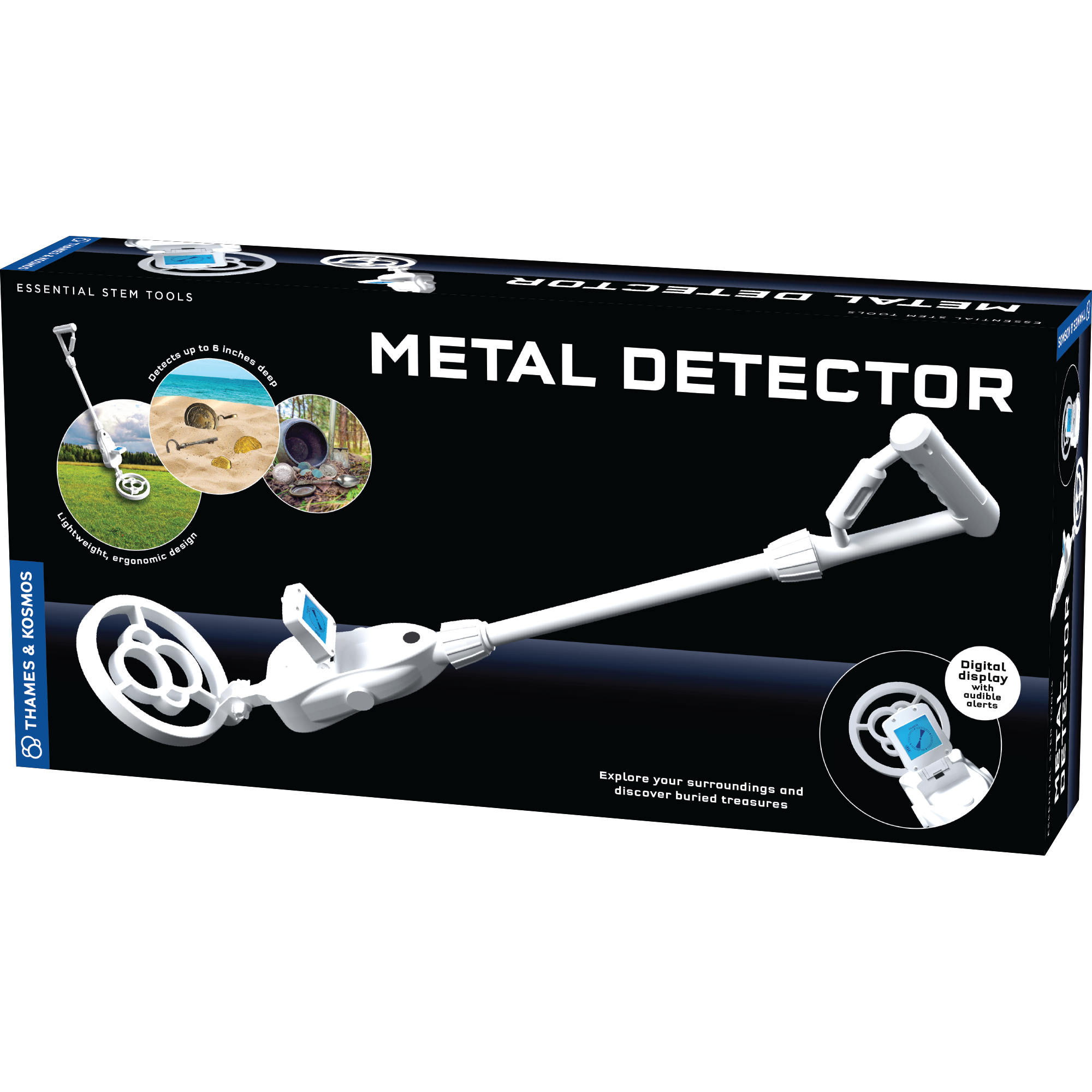 Let the treasure hunting begin! Use the Thames & Kosmos Metal Detector to detect metal objects — like gold, silver, iron, copper, and more — that are buried up to six inches deep in sand, dirt, or grass.
