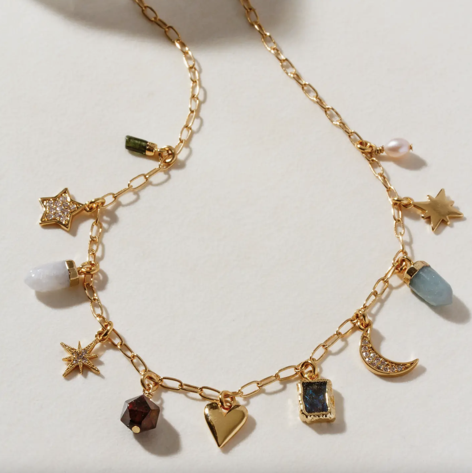 A little mystery, a little serendipity—meet the Twilight Trinkets Charm Necklace, a collection of luminous gems, each with a story of its own. Featuring a one-of-a-kind mix of green tourmaline, moonstone, garnet, labradorite, and even a freshwater pearl, this piece is a treasure trove of natural beauty wrapped up just for you. These trinkets were once lost, but now they’ve found their way into something truly special—a keepsake for your jewelry box, ready to bring a touch of wonder to every wear.