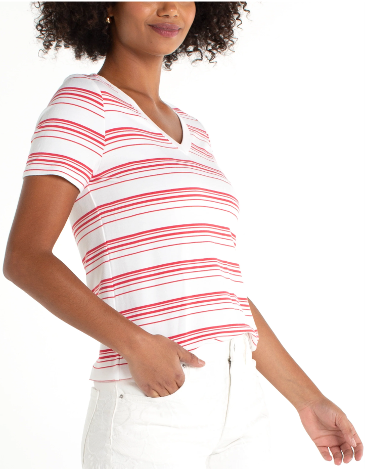 Simple but never boring. This striped V-neck tee adds a pop of cherry rose to classic white for a cool, clean take on the everyday knit. Perfect with denim, trousers, or layered under a jacket.