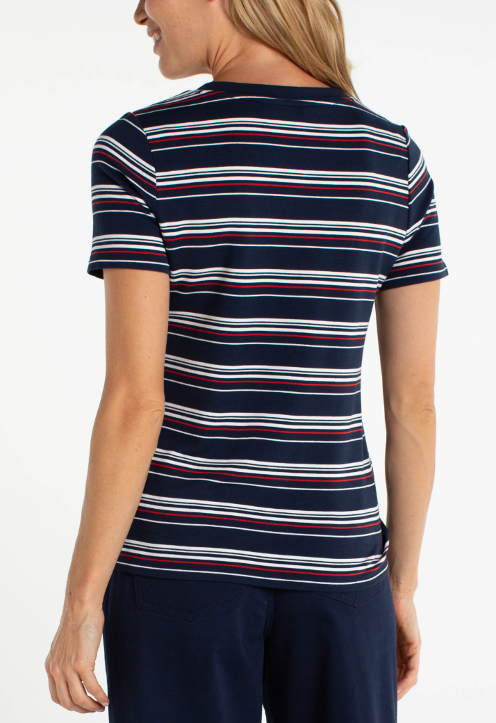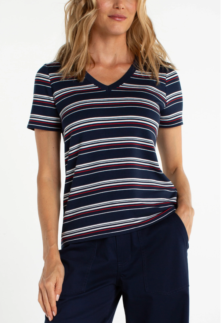 Simple but never boring. This striped V-neck tee adds a pop of cherry rose to classic white for a cool, clean take on the everyday knit. Perfect with denim, trousers, or layered under a jacket.
