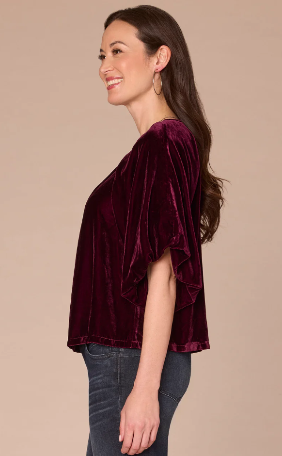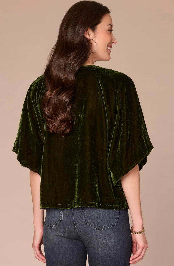 Add this velvet woven top to your date night attire for a perfectly polished look. It has elbow bubble bell sleeves, a V-neck with a chic O-ring, and a soft finish.