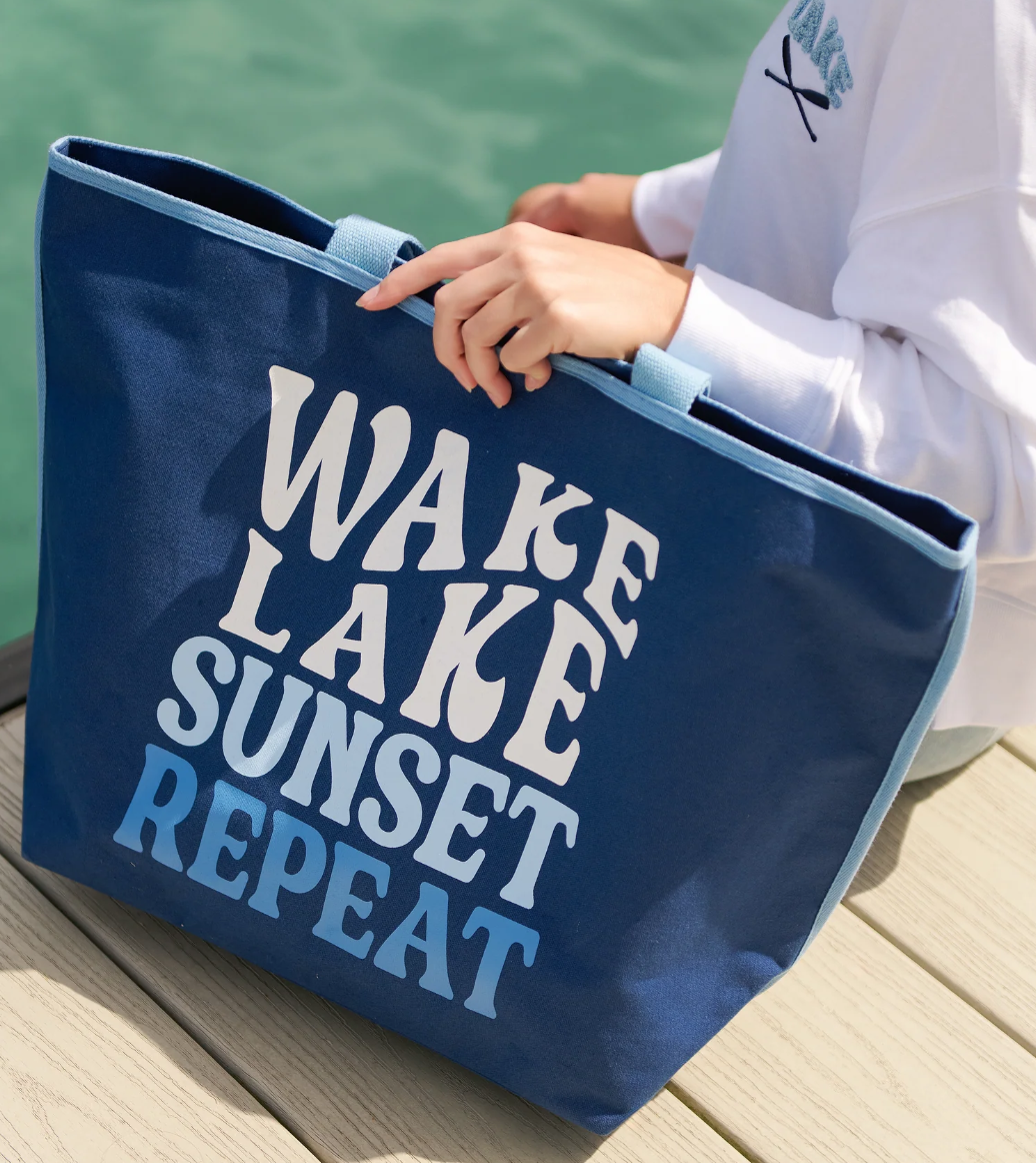 The "Wake, Lake, Sunset, Repeat" Tote is your go-to carryall for lake days and beyond. With roomy proportions and sturdy double shoulder straps, this tote fits towels, snacks, sunscreen, and more. A magnetic snap closure keeps everything secure, while the playful text adds major summer vibes. Crafted in durable canvas with bold blue hues, it's as stylish as it is functional.