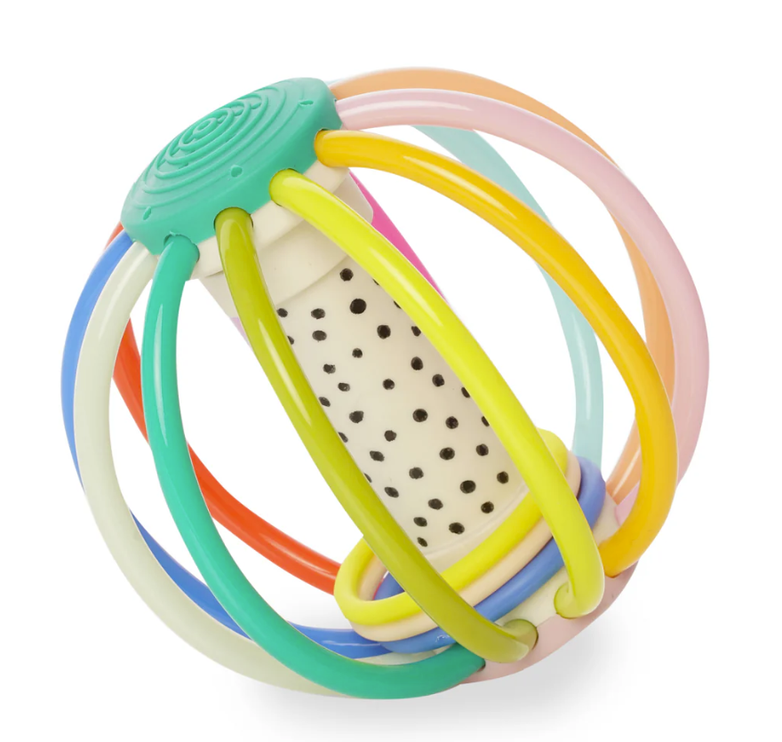 Colorful flexible plastic tubes make shaking, teething, and rolling fun. Enjoy soft whistling sounds and clacking rings with every shake.