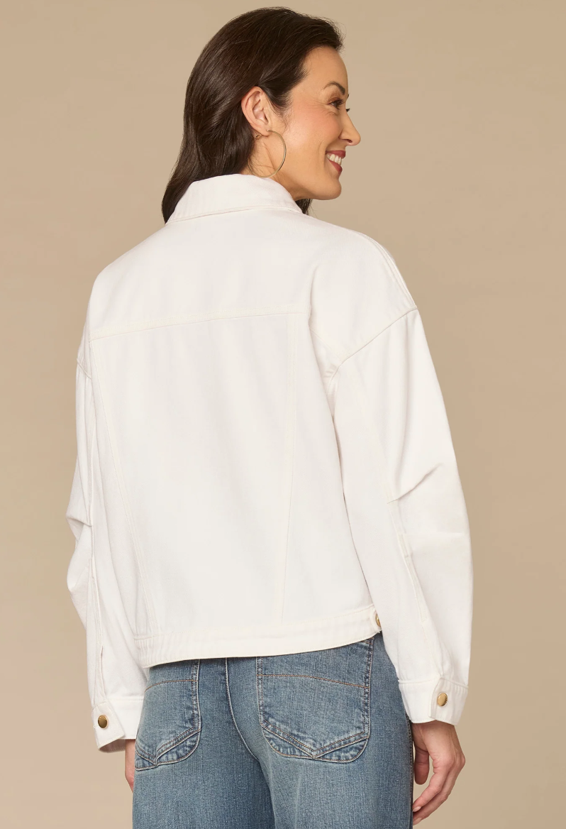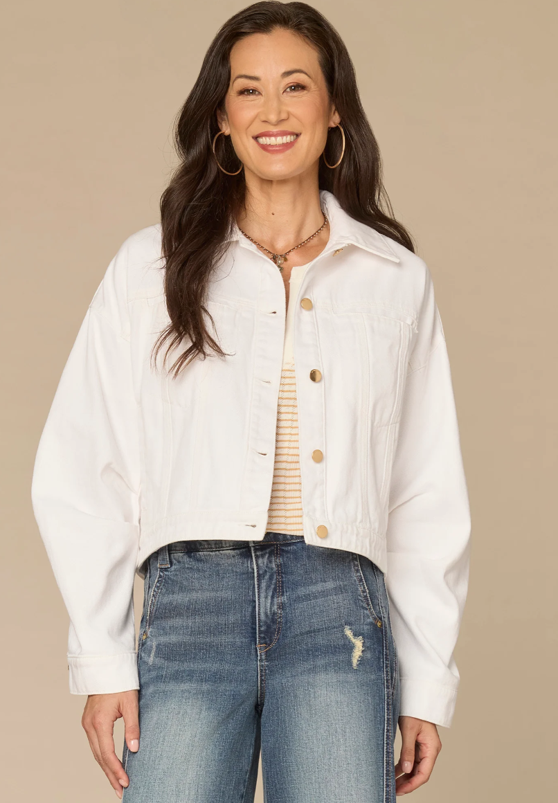 You can’t go wrong with a classic denim jacket. This optic white one is designed with long oversized barrel sleeves, a collar neck, button down front, welt pockets, and a hi-low hem.