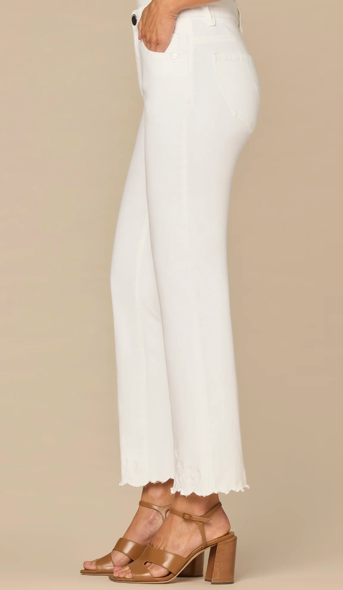 The white Itty Bitty Flare pant is fitted from the hips to calves, with a baby flared leg opening. Engineered with a cropped embroidered die cut scallop hem and "Ab"solution® fit technology to smooth, support, and enhance your shape—giving you everything from a flatter tummy to a perkier rear view.