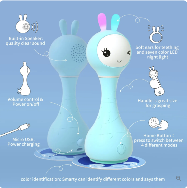 The alilo Smart Bunny Baby Rattle is an award-winning creation by early childhood experts. It's designed to support healthy brain development and foster enjoyable interactions between you and your little ones. It's a great toy for babies 0-24 months that are great for soothing, sensory development, and parent-child interaction. Parents can teach their toddlers to learn colors through the attached cards, which is a enjoyable parent-child interaction time.
